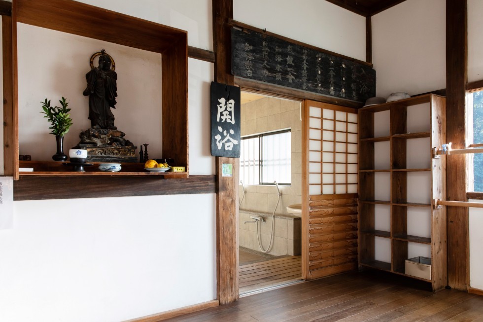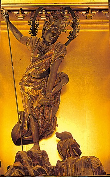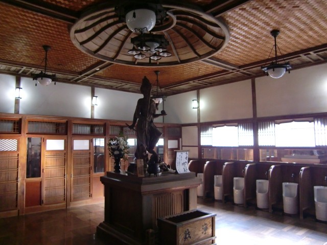 The image there is the Buddha Ususama-myoo (烏瑟沙摩明王, seen below at the entrance to another Tosu and bath house), also called Katokongoo, who symbolizes the virtue of purification, and is said to transform impurities. It is also said that the origin of Ususama Myo-oh is the Indian god Agni, able to burn away all impurities with fire.​